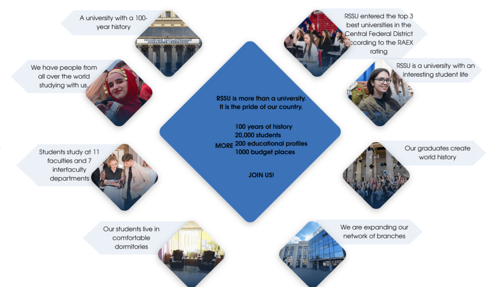 Today, more than 23 thousand students from 82 countries receive education at 9 faculties and 7 inter-faculty departments of RSSU. Training is provided in 252 main educational programs of secondary vocational education, higher education – bachelor’s, specialist, master’s programs, programs for training scientific and scientific-pedagogical personnel in postgraduate study, as well as residency.